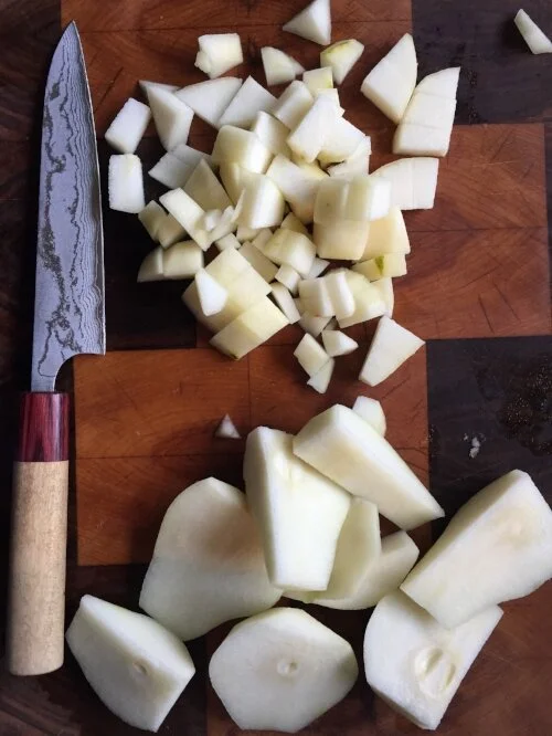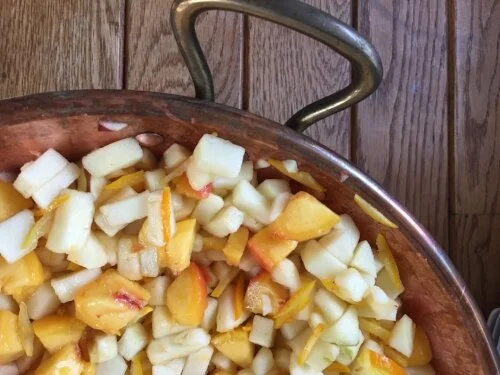 The next day drain the water from the peel and combine the peel with the orange and lemon juice. Peel your pears, apples and peaches and cut up all the fruit. Once complete add to the orange mixture.